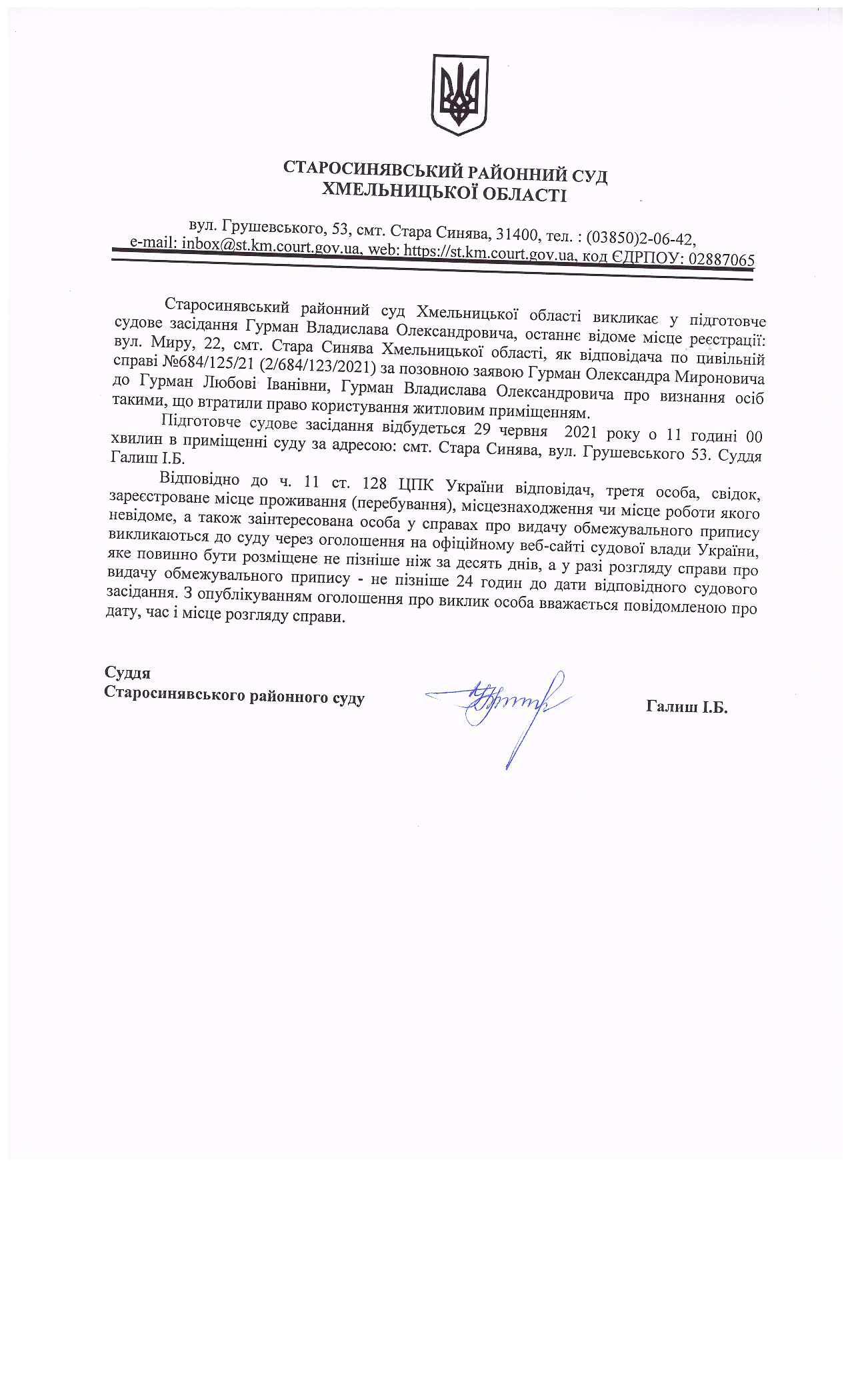 Старосинявський районний суд Хмельницької області викликає у підготовче судове засідання Гурман Владислава Олександровича