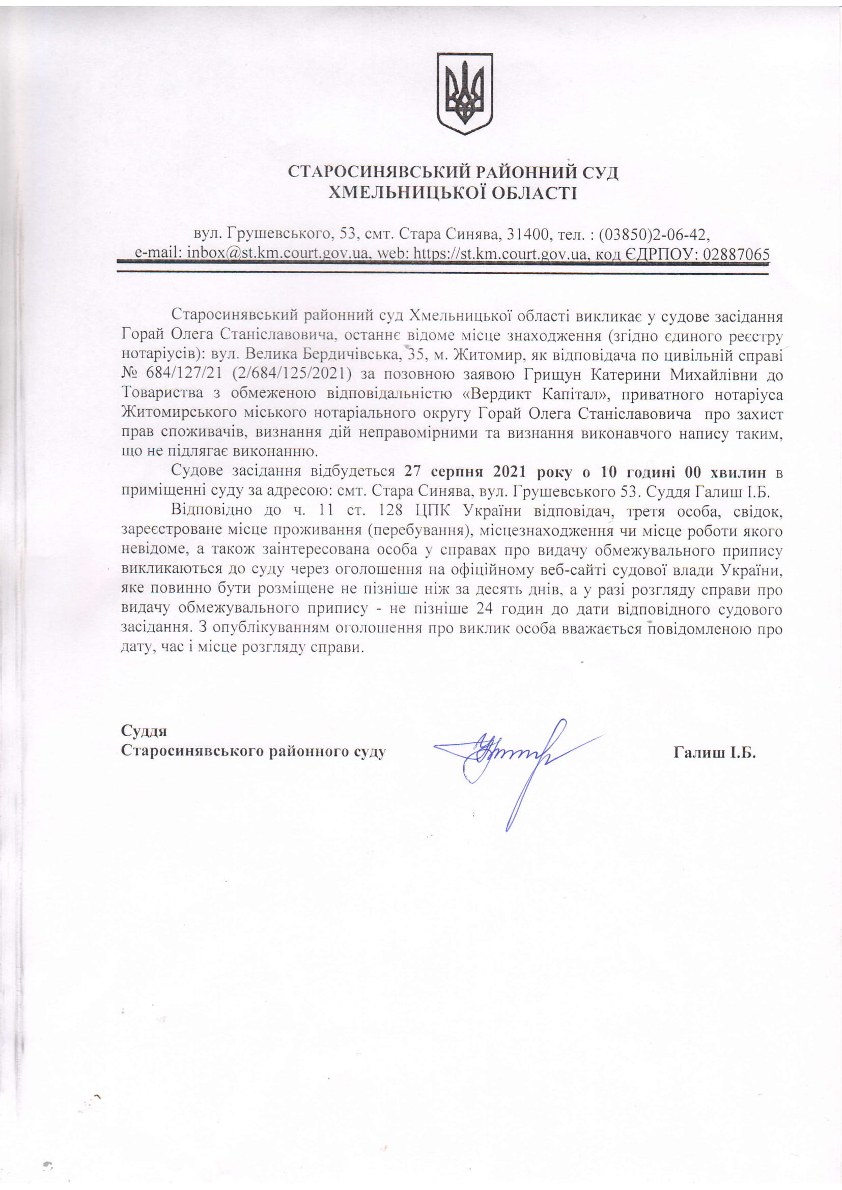 Старосинявський районний суд Хмельницької області викликає у судове засідання Горай Олега Станіславовича