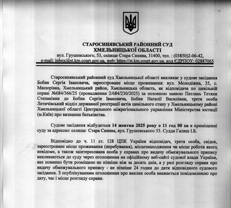 Старосинявський районний суд Хмельницької області викликає у судове засідання Бобик Сергія Івановича