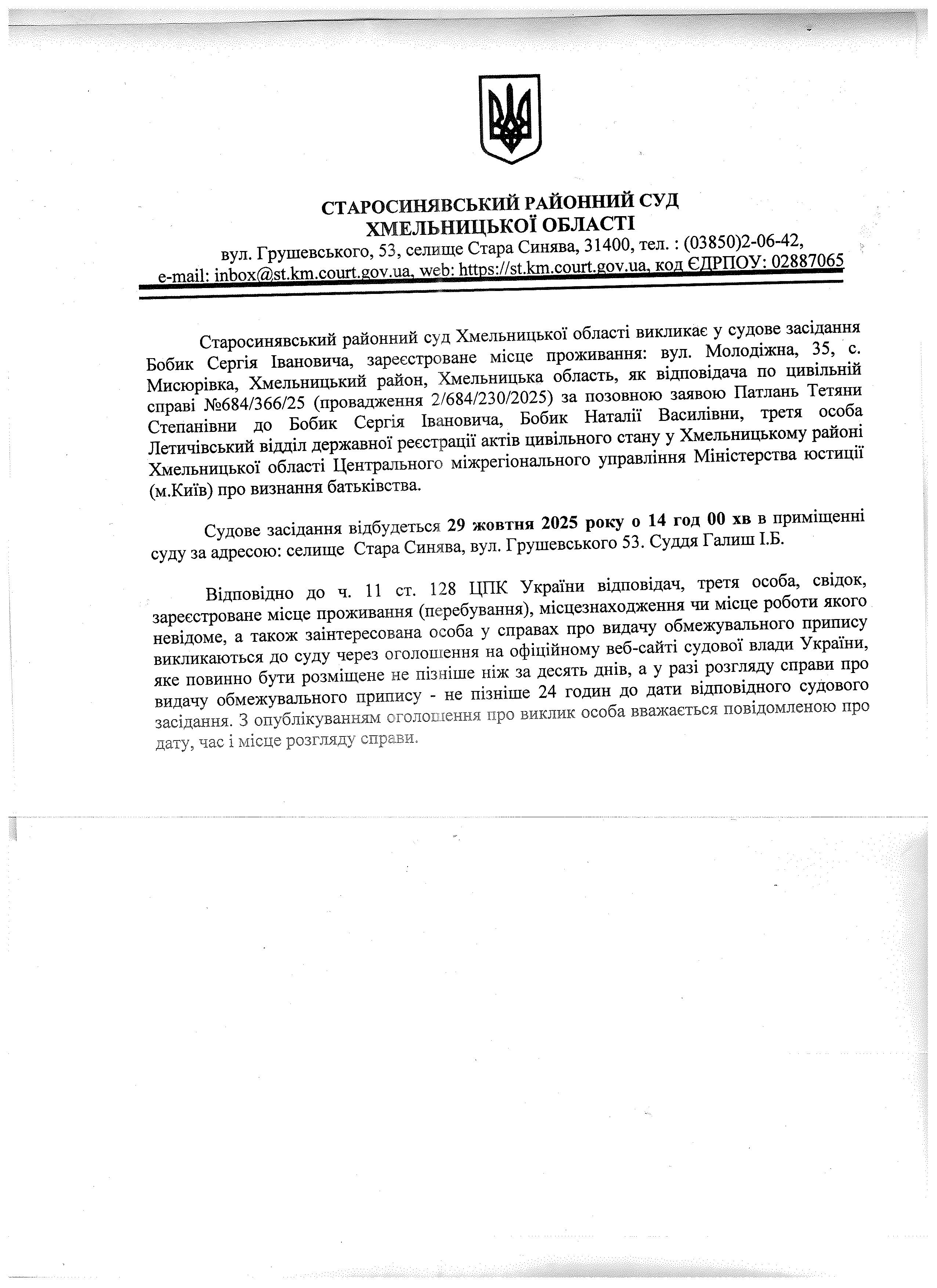 Старосинявський районний суд Хмельницької області викликає у судове засідання Бобик Сергія Івановича