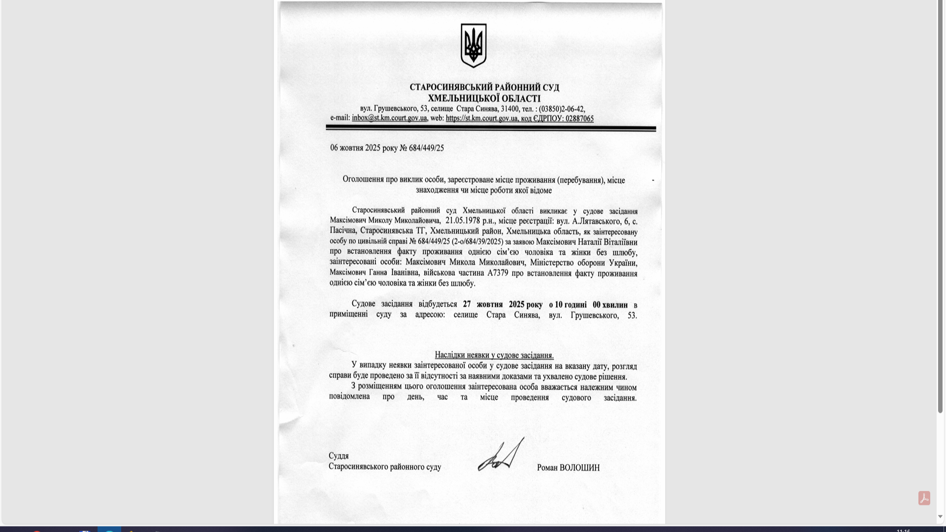 Старосинявський районний суд Хмельницької області викликає у судове засідання Максімовича Миколу Миколайовича