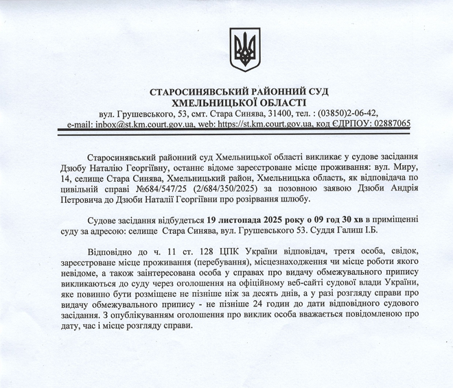 Старосинявський районний суд Хмельницької області викликає у судове засідання Дзюбу Наталію Георгіївну