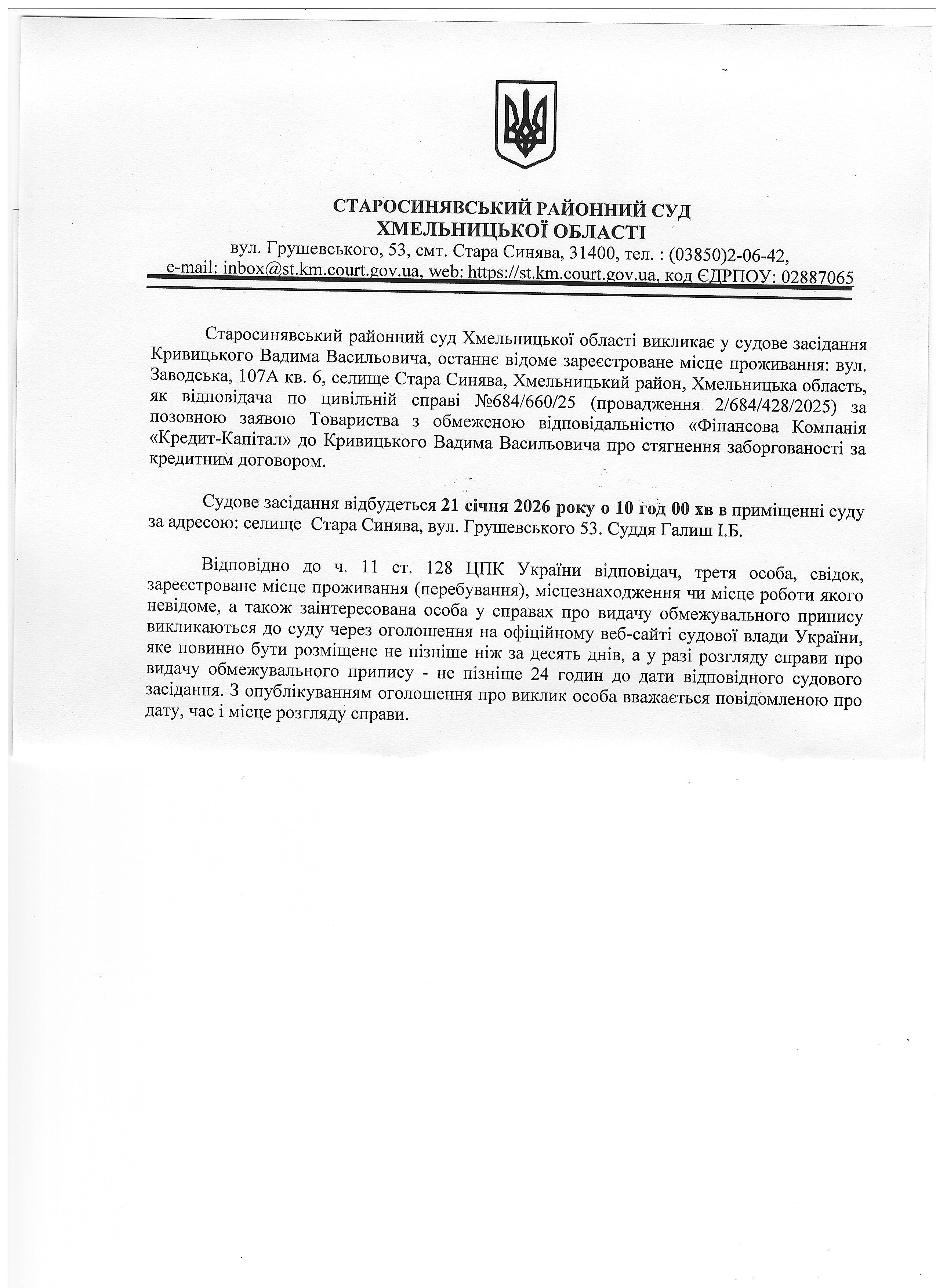 Старосинявський районний суд Хмельницької області викликає в судове засідання Кривицького Вадима Васильовича