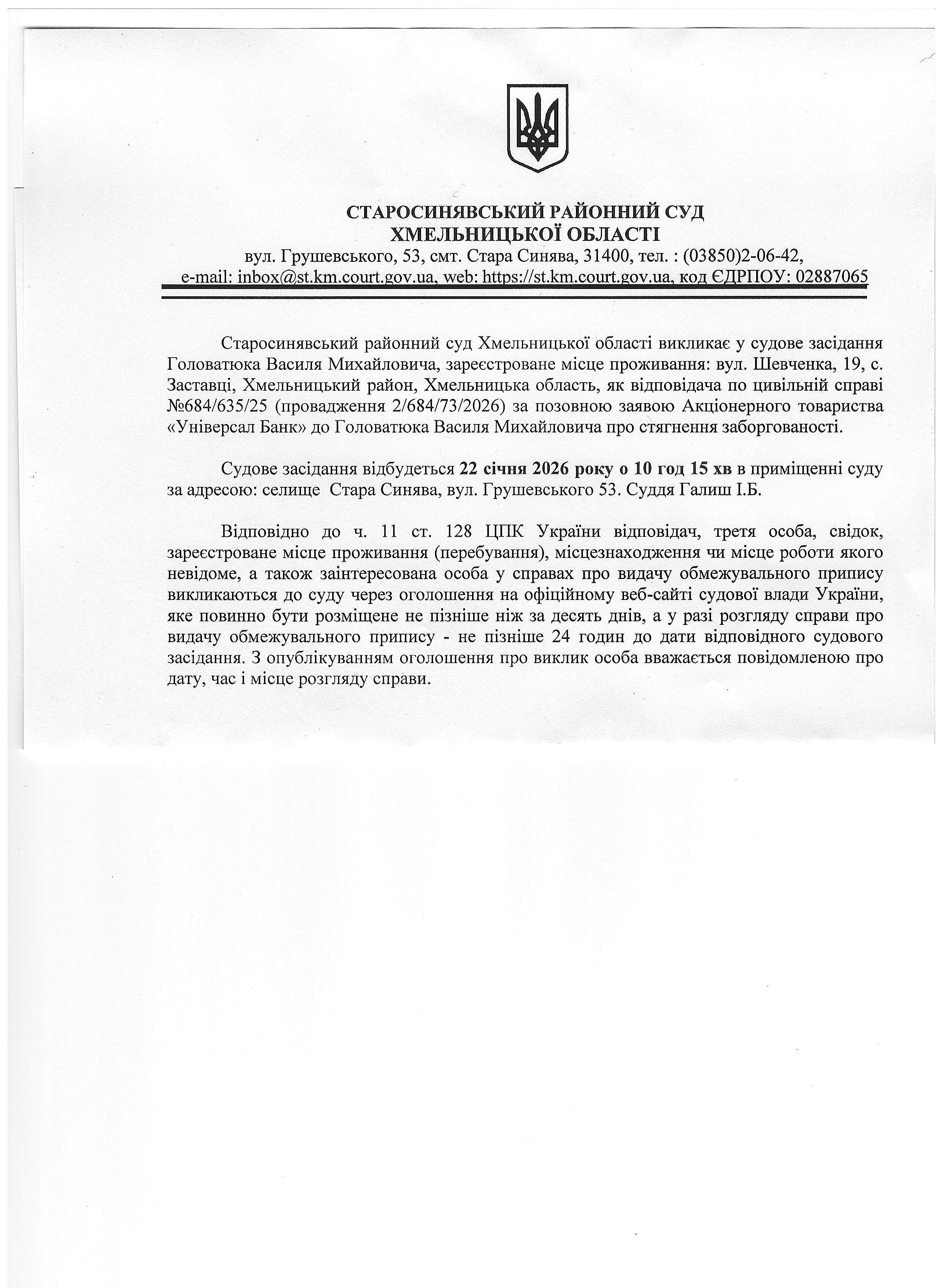 Старосинявський районний суд Хмельницької області викликає в судове засідання Головатюка Василя Михайловича